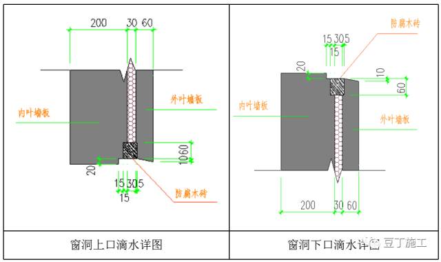 在窗洞上下口和側(cè)部都設(shè)置企口、防腐木,防腐木尺寸為100X60X50mm,內(nèi)穿錨筋一端錨固入內(nèi)葉墻一端錨固入外葉墻,50mm厚的防腐木入外葉墻15mm,入內(nèi)葉墻5mm。