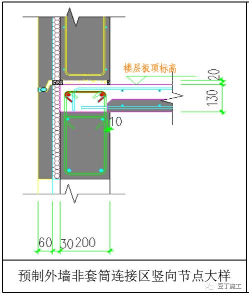 非套筒區(qū)域直接通過注入高強灌漿料連接,現(xiàn)澆板面筋伸入預(yù)制外墻進行彎折錨固。