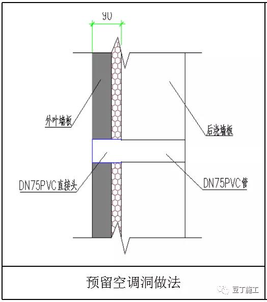 預(yù)制外墻及保溫板部位DN75PVC直接頭提前在預(yù)制構(gòu)件預(yù)埋,后澆墻板DN75PVC管在現(xiàn)場后連接。