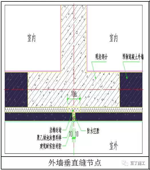 外墻由內(nèi)至外依次為現(xiàn)澆混凝土、巖棉封堵、防水空腔、聚乙烯泡沫塑料棒、建筑耐候密封膠。
