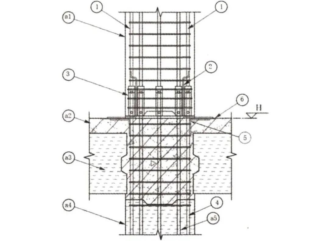 1.上部預制柱主筋;2.Ф10圓鋼;3.灌漿套筒;4.下部預制柱主筋;5.Ф10圓鋼;6.預埋接地連接板;a1.上部預制柱;a2.現澆樓板;a3.預制疊合梁;a4.下部預制柱;a5.預制柱內主筋