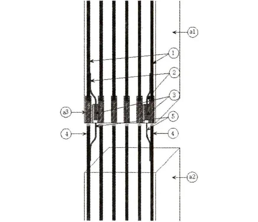 1.上部預制柱主筋;2,Ф10圓鋼;3.-40 X 4鍍鋅扁鋼;4.下部預制柱主筋;5.Ф10圓鋼;a1.上部預制柱;a2.下部預制柱;a3.灌漿套筒